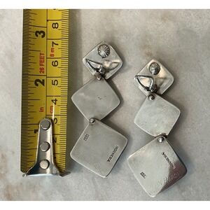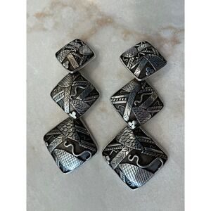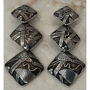Striking statement earrings that exude artisan craftsmanship. These earrings showcase a three-tiered diamond shape design, each intricately adorned with detailed engravings. Crafted from sterling silver, they feature a post backing for secure wear.