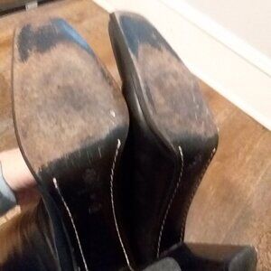 Channel Emma Peel in these zippy all-leather boots made in Italy. They have 3-1/2" heels and overall 19" height with zippers up the back. Gentle wear makes these black boots just soft enough for comfort. Size is 8.5 M. Circumference of uppers at the top is 15".