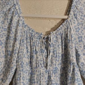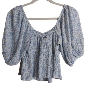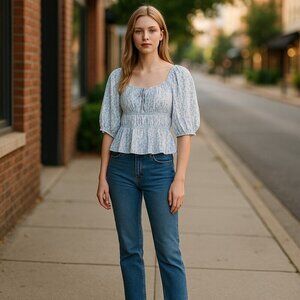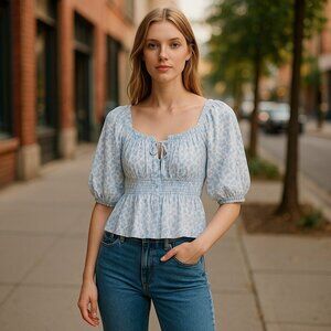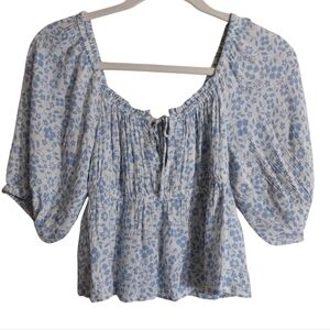 Charming floral blouse with puff sleeves. Features a square neckline and gathered front. Perfect for casual outings.