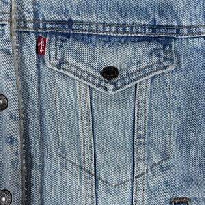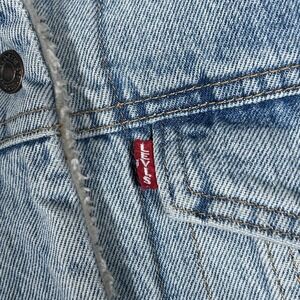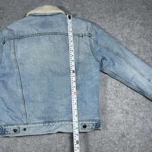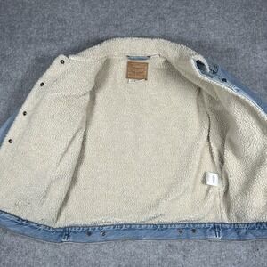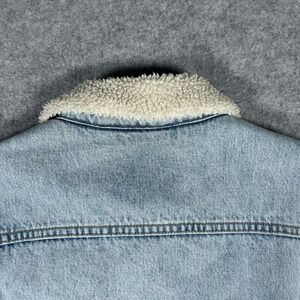 Light blue denim jacket with a cozy cream collar. Classic button-up design. Perfect for casual wear.