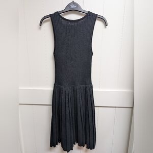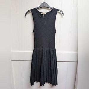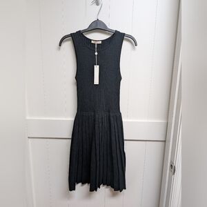 Chic Black ribbed knit dress with pleated bottom. Ideal for versatile styling.