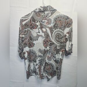 Stylish paisley print blouse with a tie-front design. Features a mix of colors for a chic look. So cute and comfy, no flaws!