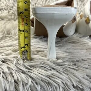 The product is a pair of Steven NY Irvan white embellished gold studded stiletto heel sandals in size 10. These stylish pump heels feature an open toe design, slip-on closure, and a mid-height stiletto heel. The white color with gold accents gives these sandals a sleek and fashionable look, perfect for adding a touch of glam to any outfit. Made with man-made materials, these shoes are designed for women who want to make a statement with their footwear.
