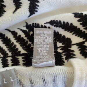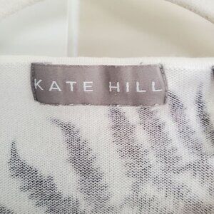 Kate Hill white cardigan with black fern leaves pattern and long sleeves. 100% cotton soft knit fabric. Soft, smooth and cozy. Classic and stylish design. Beautiful black imprints of explicit and shadow fern leave on snow white field. Good for any occasion. Pre-owned in very good condition. Hand wash in cold water. Shoulder-to-Shoulder 15 in, Pit-to-Pit around 38 in, Sleeves 23 in, Length 21 in.