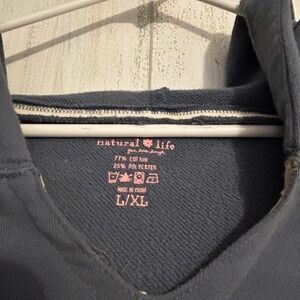 Cute Boho floral design Natural Life cozy hoodie. Perfect for casual wear. Dark blue background with purple around the bottom of the sweatshirt and sleeves.