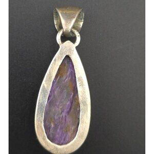 This elegant pendant features a stunning purple charoite gemstone set in sterling silver. Its teardrop design offers timeless sophistication and charm.