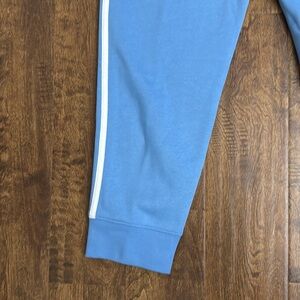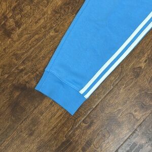 These Adidas sweatpants feature a vibrant blue color with iconic white stripes, offering a sporty and energetic look. Made from a soft material, they provide comfort and flexibility for both athletic activities and casual wear. The tapered fit ensures a modern and stylish appearance.