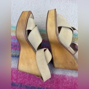 Leather: Cowhide Suede Crisscross Straps Wood Heel And Platform Wrap Around Buckle Ankle Strap With Elastic Inset Open Toe Rubber Sole Imported, Vietnam This Item Cannot Be Gift-Boxed Measurements Heel: 3.75In / 95Mm Platform: 1.25In / 33Mm