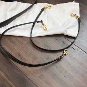Elegant Coach satchel in navy blue. Features gold hardware and tags. Perfect for any occasion.