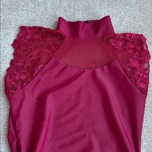 Beautiful burgundy stretchy bodysuit/leotard with lace shoulder details and a mesh front. This has a high neck with a closure in the back and a very low back. This is a gorgeous leotard, or if you’re not into dance, this would be so perfect to wear with a skirt or jeans for Valentine’s Day. Very sexy and flattering! This retails new on the current website for $74. Women’s size large, smoke free home.