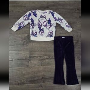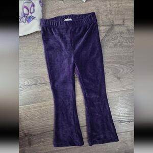 Stylish graphic plush top with purple ribbed velour flare pants.