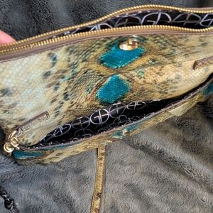 So beautiful in person, and those colors!! The blend of blues, browns and gold tones makes it versatile for various occasions. Like new, no tags, plastic still on inside zipper showcasing minimal usage!