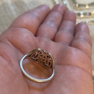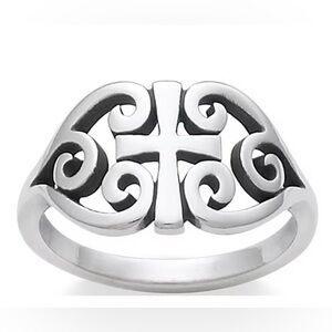 Elegant silver ring featuring a cross and swirl design. Perfect for adding a touch of sophistication to any outfit.Preowned beautiful Ring in great condition . Will have to get it polished .Sterling Silver stamped 925 on inside .