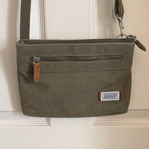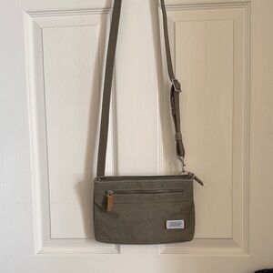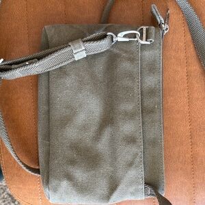 Stylish Travelon crossbody bag. Features front zip pocket and adjustable strap. Perfect for travel and daily use.
