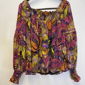 Keywords: boho, bohemian aesthetic, butterfly print, floral print, smocked top, balloon sleeve, anthropologie style, vibrant colors, ladder lace, square neck blouse, whimsigoth, festival wear, cottagecore