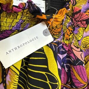Alexandra Farmer for Anthropologie blouse features a vibrant butterfly and floral print in a bold pink combo. Designed with a smocked square neckline and long balloon sleeves with smocked cuffs and ladder lace detailing, this airy top offers a bohemian aesthetic. The lightweight fabric and relaxed fit make it a versatile piece for seasonal styling.