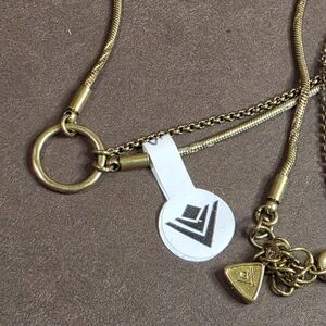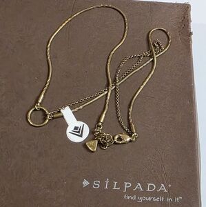 Adorn your neckline with this striking Silpada layered necklace. A delicate snake chain intertwines with a finer link chain, creating a captivating visual depth. The main chain features a substantial hammered ring charm, offering a touch of minimalist elegance. A small triangular pendant, subtly embossed with the Silpada logo, dangles from the secondary chain, adding a refined detail. The warm brass tone exudes a vintage charm, perfect for adding a sophisticated accent to your everyday look or elevating a special evening ensemble.