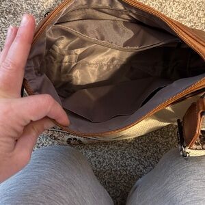 Stylish brown crossbody bag featuring a unique patterned strap. Perfect for everyday use.