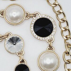For sale is a stunning chain belt with faux pearls & black and clear rivolis surrounded by Rhinestones