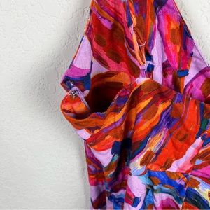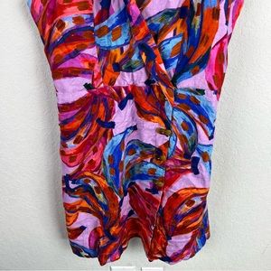 Keywords: Farm Rio banana dress, tropical mini dress, linen wrap dress, orange purple summer dress, faux wrap sundress, Farm Rio large, women’s L mini dress, colorful vacation dress, beach party dress, boho tropical style