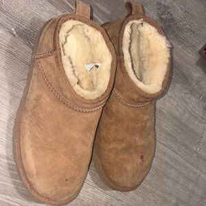 Comfortable UGG slippers with plush cream lining. Ideal for cozy wear.