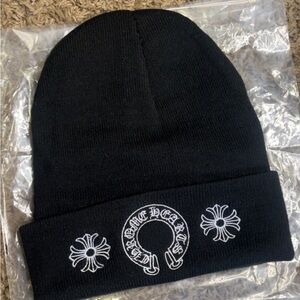 Stylish black beanie featuring intricate white embroidery. Perfect for adding a touch of flair to your outfit.