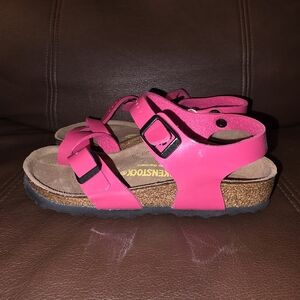 Vibrant fuchsia sandals by Birkenstock. Comfortable and durable design. Ideal for playful adventures.