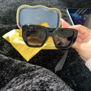 Elegant black sunglasses with a striking gold emblem. Includes a vibrant yellow case.