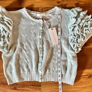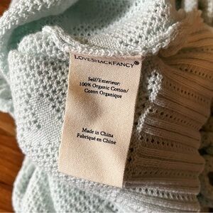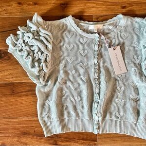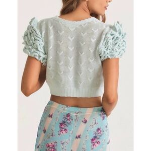 100% organic cotton, short puff sleeves with ruffle detail, button front, open knit with heart pattern, approx measurements shown, cropped silhouette, mint frost colorway, new with tags, perfect for spring