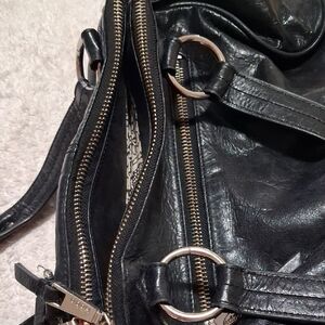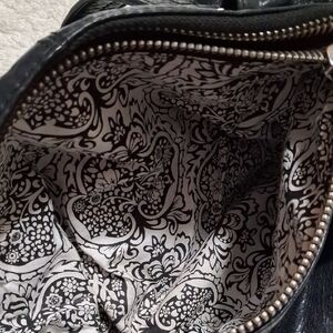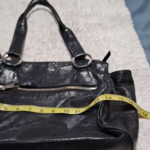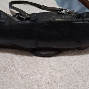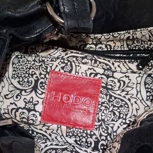 Chic black leather shoulder bag by HOBO. Features a front zipper pocket and sturdy handles. Ideal for everyday use.