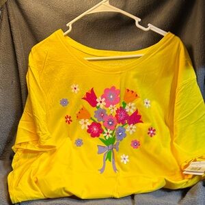 Bright yellow tee with colorful floral design. Features pink, purple, and orange flowers. 100 cotton