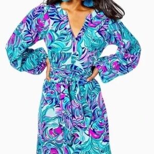 Lilly Pulitzer Bedelia Dress Seasalt Blue Don't Wanna Leaf Sash Long Sleeve M