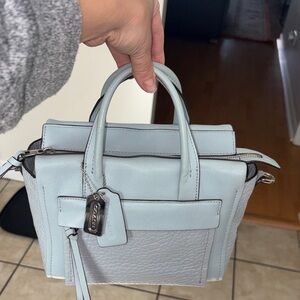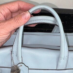 Chic Coach satchel in sky blue leather. Features dual handles and a front pocket. Stylish and versatile.