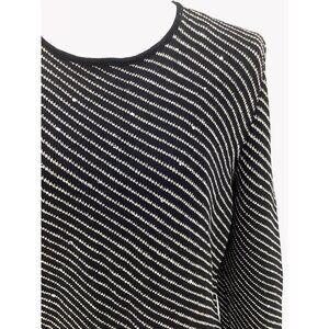 This sweater features a chic diagonal stripe design in black and white, perfect for a polished yet comfortable look. Crafted for cooler weather versatility.