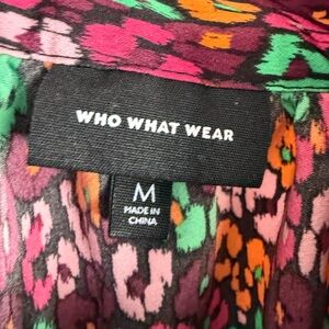 Who Wore What top size M with vibrant multicolor design. Features a stylish pattern for a bold look. Had a scarf tie in the front. In like new condition.