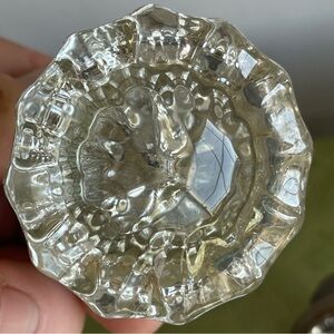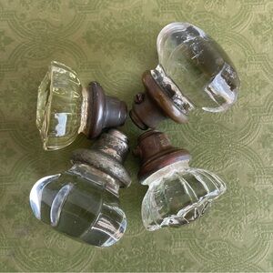 Set of vintage glass door knobs with a classic design. Features clear and silver tones.