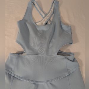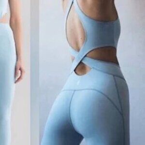 Elevate your style with this chic light blue jumpsuit. Perfect for any occasion, it offers both comfort and elegance. Make a run for it in this cardio-ready jumpsuit cut from a stretchy, buttery-soft knit with a bold, strappy back and the light support of a built-in shelf bra.