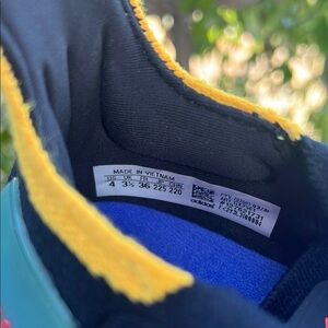 Stylish Adidas athletic shoes. Black mesh upper. Blue laces. Comfortable fit. Pre-loved shoes in excellent condition. Size 4 fits a 51/2 or a size 6. Note: I’m a size 6 and they fit me but I'll leave that to your own decision. All of your questions are welcome. No box! Thank you.