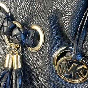 This beautiful Astor bucket‑style tote features braided handles, oversized gold grommets, and playful front tassels that give it a bold, boho‑luxury feel. The exterior is crafted from lightweight linen, making it easy to carry while still offering impressive capacity. A gold MK metal bag charm adds the perfect finishing touch.