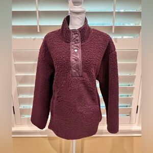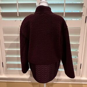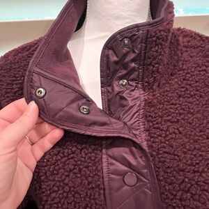 Cozy teddy jacket with a rich burgundy hue. Features a stylish button-up front. Ideal for warmth and comfort.