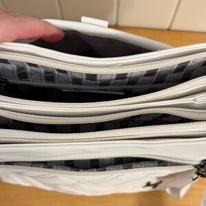 Chic and functional crossbody bag by Lug. Quilted design in elegant bright white. Ideal for daily use. Lots of packets and zippers. No flaws, as it was used 1 day. In Excellent condition. Lug double dip.
