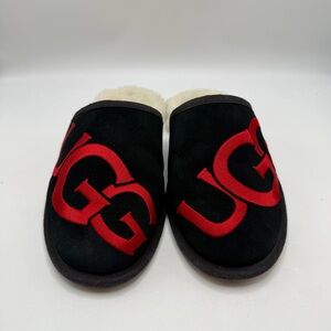 Classic UGG men’s slippers featuring a cozy shearling lining and bold red logo.
