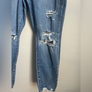 You are looking at blue high-rise jeans by American eagle. This pair of jeans has Button / Zipper closure, 3 frontal pockets and 2 back pockets for great style and flexibility. This jeans forms a flexible and skinny fit. MSRP:$59.95