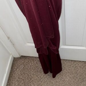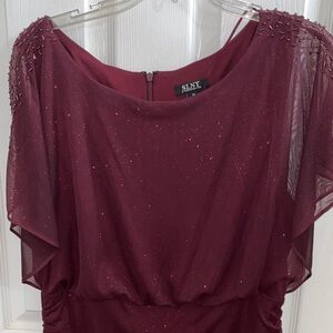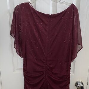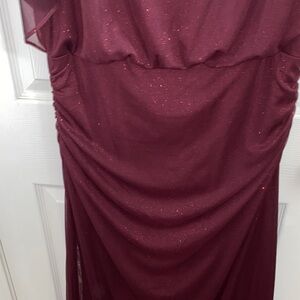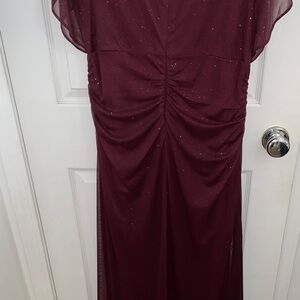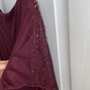 Chic burgundy maxi dress by SLNY. Features subtle sparkle. Perfect for formal events.