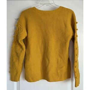 Madewell charming cable knit sweater with playful baubles detailing along the sleeves, adding a touch of whimsy to a classic design. Featuring intricate cable knit patterns across the front, ribbed cuffs, hem, and a comfortable round neckline. Side slits at the hem offer a relaxed fit, while the vibrant mustard yellow hue ensures versatility and stands out, and the soft merino wool provides warmth and comfort. Perfect for cozy fall days, weekend outings, or adding a pop of color to your work-from-home wardrobe. Size small, measurements lying flat pit to pit 19", length 21.5" and sleeve from shoulder seam to cuff 19", Excellent condition.