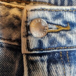 The Avec Les Filles Size 28 Straight High Rise Split Hem Acid Wash Distressed Jeans are a stylish and trendy addition to any woman's wardrobe. Made from 100% cotton denim in a solid blue color, these jeans feature a high rise waist and a straight leg fit. The acid wash and distressed detailing give them a unique and edgy look, perfect for pairing with your favorite top for a casual yet fashionable outfit. Complete with a zip and button closure, these jeans are comfortable and practical for everyday wear. EUC. No callouts. $150 MSRP