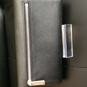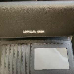 Chic black clutch by Michael Kors. Features textured finish and logo detail.