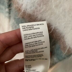 Cozy teddy jacket with a stylish plaid pattern. Features cream and blue tones. Perfect for layering. Size medium, fits oversized. Like wearing a thick wool blanket.