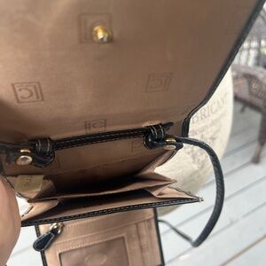 Elegant black crossbody bag with crocodile texture. Features a gold logo accent. Perfect for any occasion. The logo comes with minor scratches, and the item is used condition. Some stains inside. What you see is what you'll be getting. Thank you.