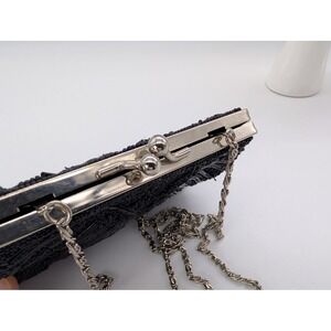 The bag features a secure silver-tone double-ball kiss lock clasp and a versatile detachable silver chain strap, allowing you to carry it as a sleek clutch or wear it as a shoulder bag. The interior is lined in smooth black satin and includes a small slip pocket for your essentials, along with the authentic Whittall & Shon woven label. A true collector's item that blends mid-century charm with modern red-carpet style.